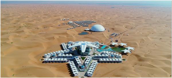 腾格里沙漠,是我国第四大沙漠。蒙古语中,"腾格里"是"天"的意思,形容这片沙漠"像天一样高远、辽阔".2020年10月,沙漠星星酒店落地腾格里沙漠,成为这片天空中的一颗"新星".从空中俯瞰,整个酒店建筑呈五角星形状排列,与沙漠星光主题相契合,圆球状的建筑矗立,宛如太空基地,充满科幻感和现代感。